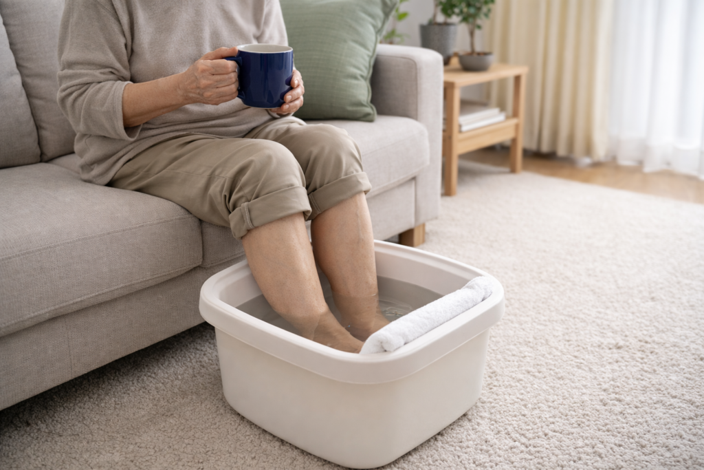 私は深めの容器(バケツ)で脚のふくらはぎの真ん中ぐらいまでお湯に浸けている