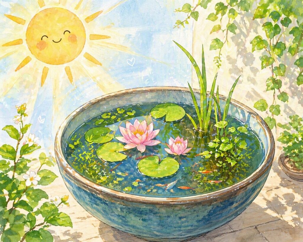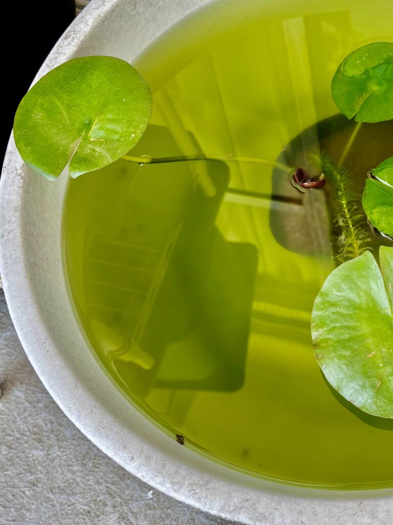 グリーンウォーターが出来やすい白い容器、睡蓮鉢。